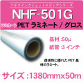 高透明PETラミネート グロス。高透明塩ビなどにも使用できるラミネート。保護用ラミネートとして最適なラミネート。 品番:NHF-501G サイズ:1380x50m 50μ
